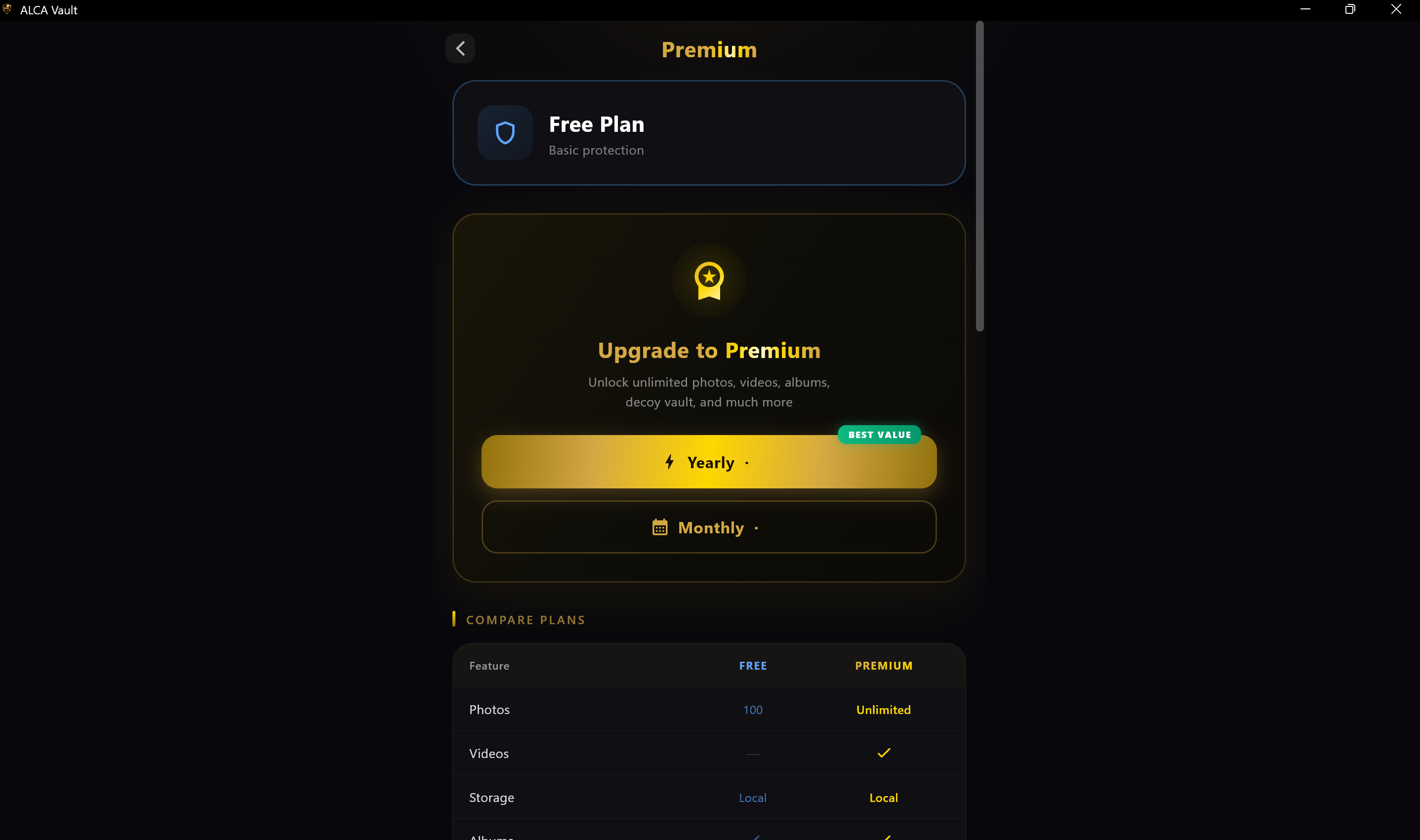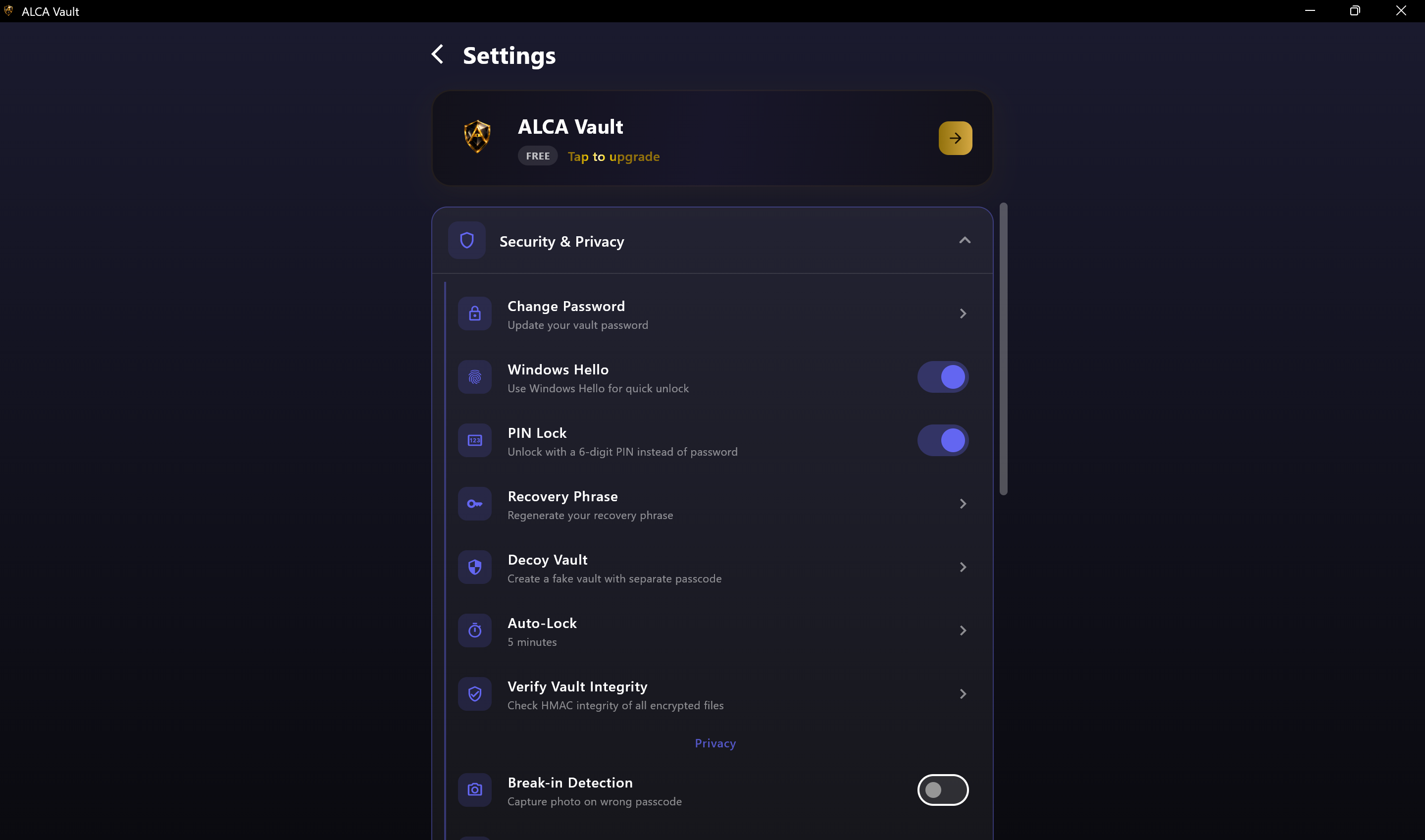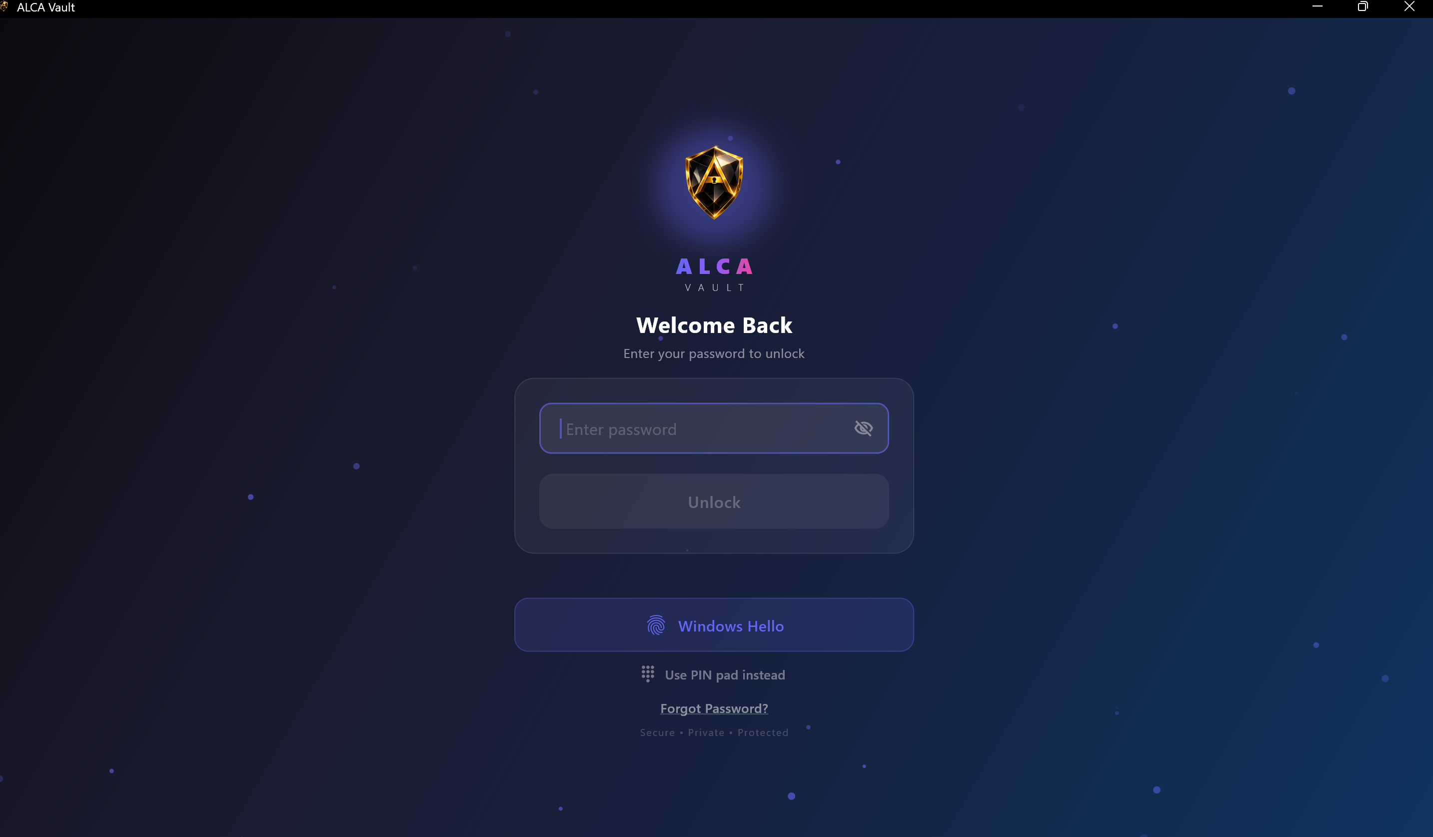 ALCA Vault is a secure media vault that protects your private photos and videos using AES-256 encryption, Windows Hello biometric authentication, and passcode protection.